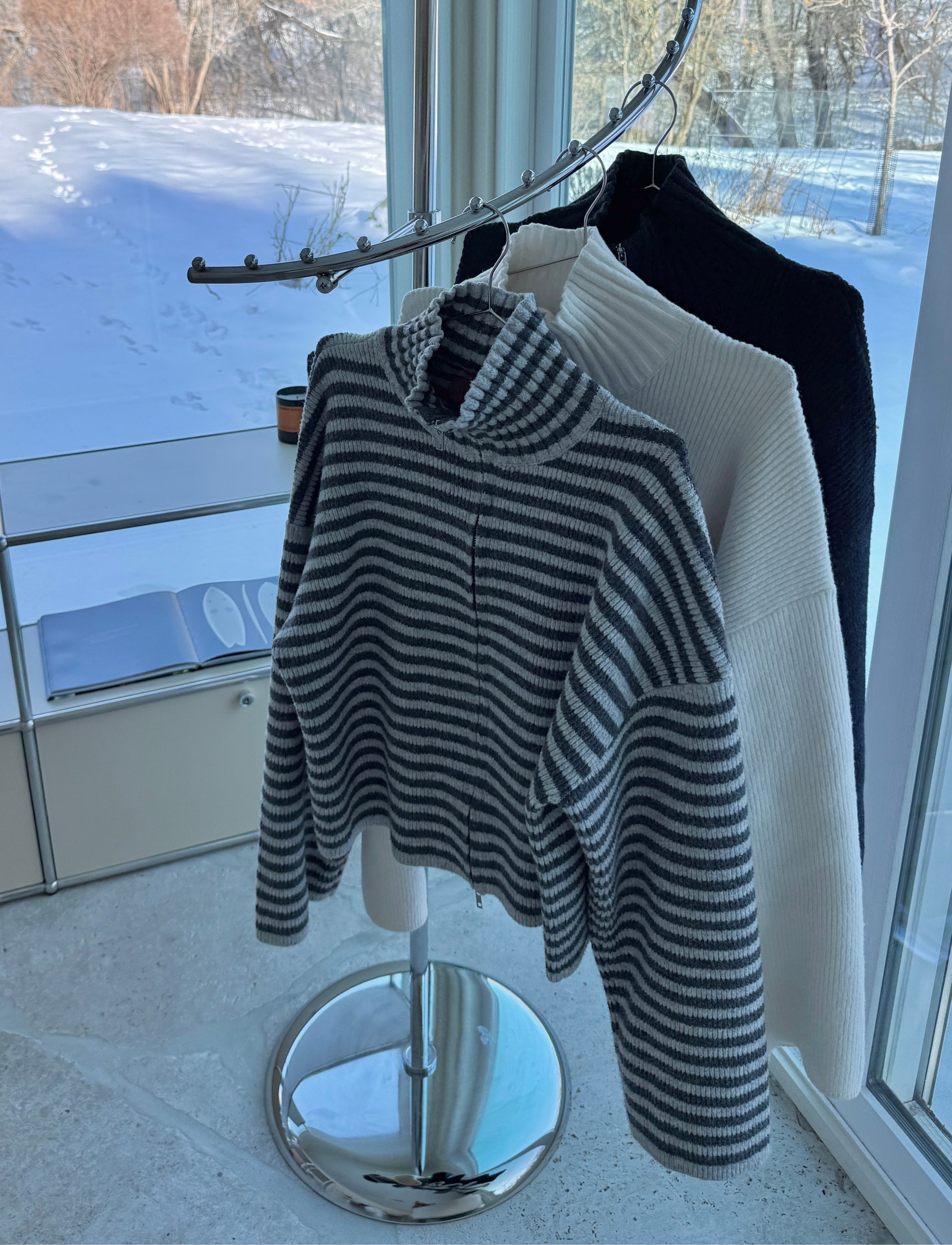 An elevated layer you’ll wear on repeat. Cut from the same hand-selected luxury yarn you love—thick but never heavy, soft, and built to hold its shape. Designed with a high (not suffocating) mockneck, wide sleeves, and a clean, intentional length. Finished with double chrome zippers. Easy on its own, better styled with the matching Knit Pants.